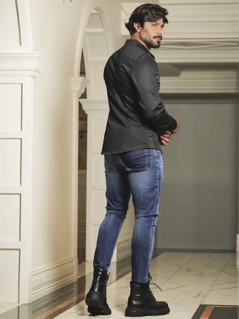 Esta camisa preta masculina foi criada para unir design clássico com acabamentos modernos e refinados. A modelagem ajustada ao corpo valoriza a silhueta com conforto, enquanto os punhos com entretela fina, a gola estruturada e os botões de pressão de 12 mm reforçam a estética alinhada e técnica. Ideal para composições sofisticadas, a peça possui barra com finalização de 2 cm, além de aplicação interna da composição para receber tag com acabamento de alto padrão.